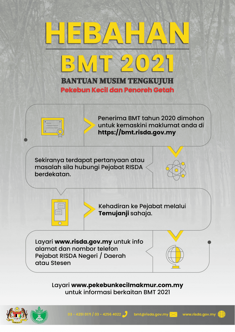 Tahukah anda? Satu bantuan akan disalurkan pada bulan Disember yang berjumlah RM300. Bantuan Musim Tengkujuh (BMT) merupakan bantuan yang diberikan khusus kepada pekebun kecil dan penoreh getah bagi meringankan beban mereka yang akan berhadapan dengan musim tengkujuh.