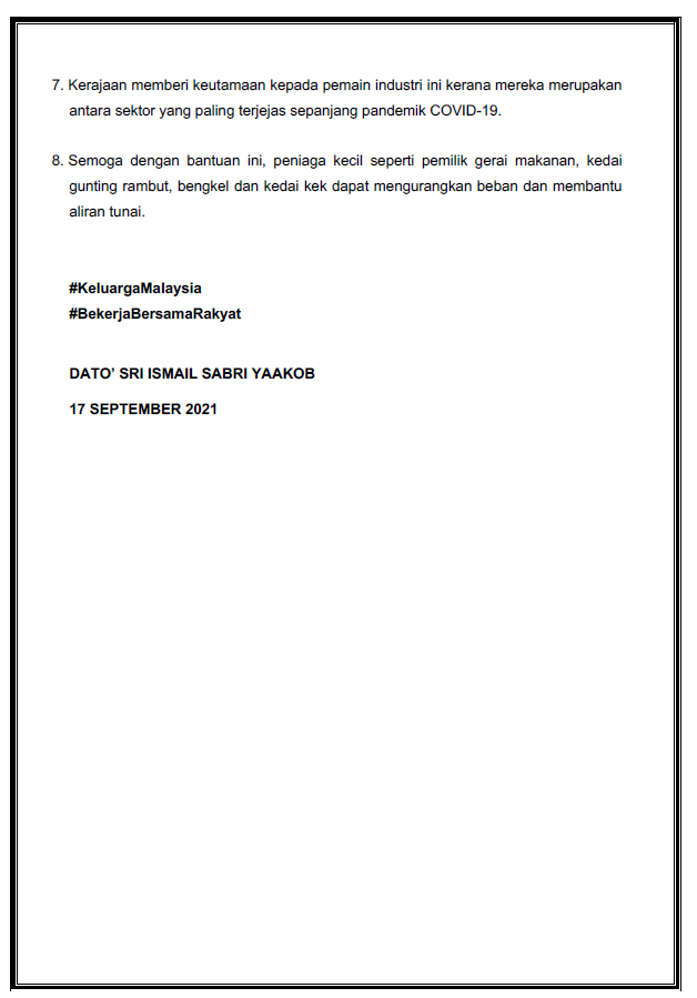 - Bermula 21 September 2021 secara berperingkat dengan amaun bantuan sebanyak RM500.