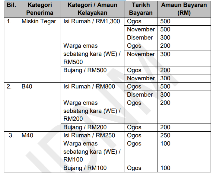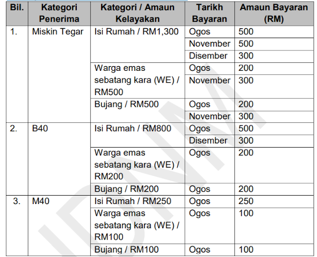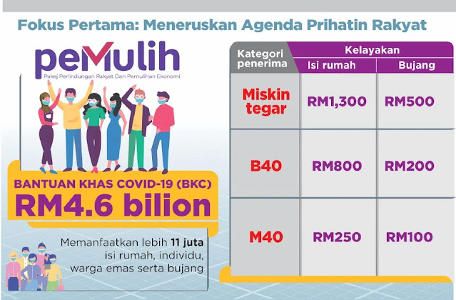 Mengikut Berita Harian, Perdana Menteri mengumumkan menerusi BKC, isi rumah miskin tegar akan menerima RM1,300 iaitu RM500 pada Ogos, RM500 pada November dan RM300 Disember, manakala individu bujang miskin tegar pula akan menerima RM500, iaitu RM200 pada Ogos dan baki RM300 (November).